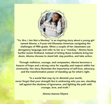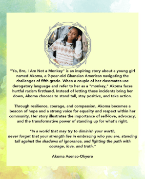 “Yo bro, I’m not a monkey” is an amazing story of resilience, empowerment, and confidence. This story is so inspiring and relatable for all who are proud of their heritage and have faced challenges because of it. I love how Akoma takes a negative situation and turns it into a positive movement!