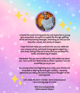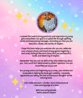 I was very impressed that the author, Ms. Akoma Asenso-Okyere, was able to share her lived experiences in such an innovative way. The book is an easy read for all ages. The book is also very colorful, which will spark the interested of younger readers. The fact that the author was able to utilize her experiences in a positive way is very intriguing. There are many individuals, especially, children in K-12, who may be experiencing similar situations in today's society, and this book shows that confronting racism, colorism, discrimination, or any form of disrespect can be combated with love, understanding, effective communication, and self-respect. Great work, Akoma!!!!!!